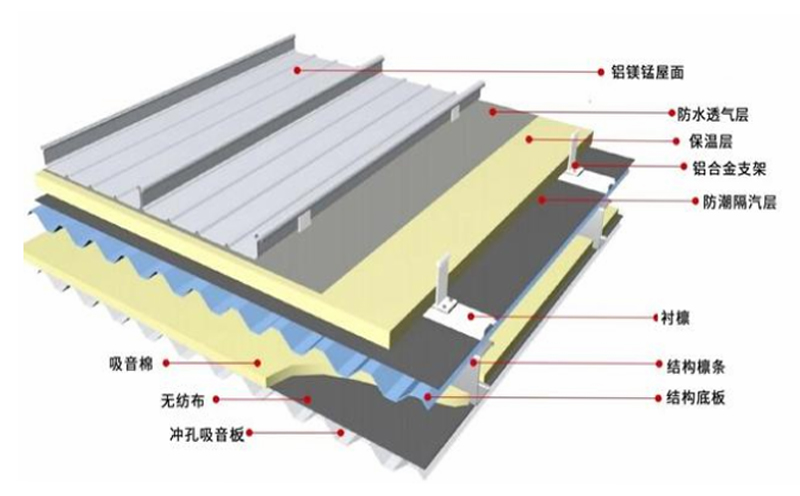 铝镁锰合金屋面板之所以能在建筑领域广泛应用、备受青睐,不仅源于其自身轻质高强、耐腐蚀等优良特质,更得益于科学严谨的构造层次设计与规范施工工艺的双重赋能。板材结构层由下至上精准排布,各层分工明确、协同……