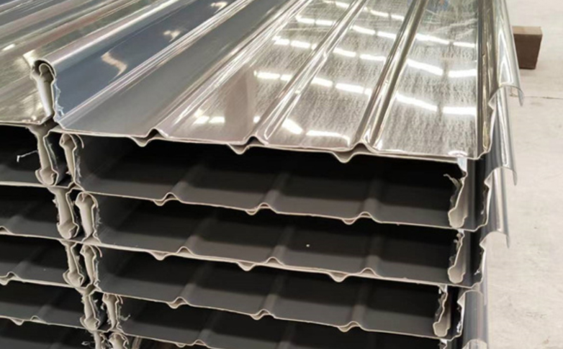 铝镁锰直立锁边板的固定连接方式为锁扣式咬合连接,施工人员将板材抬到安装位置,就位时先对准板端控制线,然后将搭接边用力压入前一块板的搭接边。
